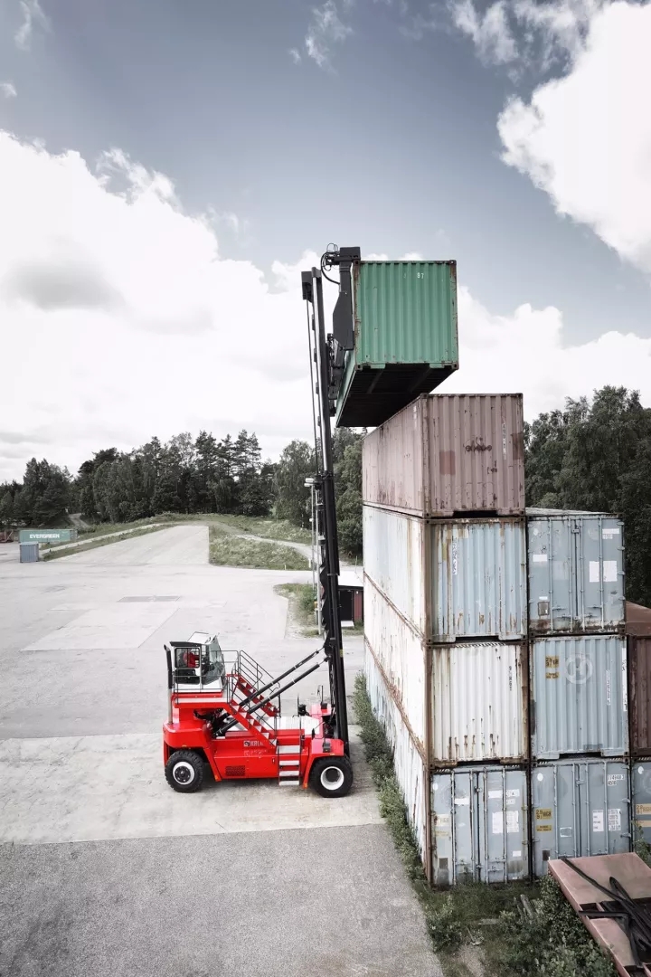 卡尔玛Essential系列空箱堆高机(DCU80-100)提供了三种不同起升能力,包括8、9和10吨,及四种门架高度以满足不同的堆垛能力。同Essential系列正面吊一样,三种传动系统组合和两种排放标准的发动机可供客户选择。所有Essential系列正面吊和空箱堆高机均配备了一款负荷传载液压系统,用于测量载重并根据载重分配高效动力。
