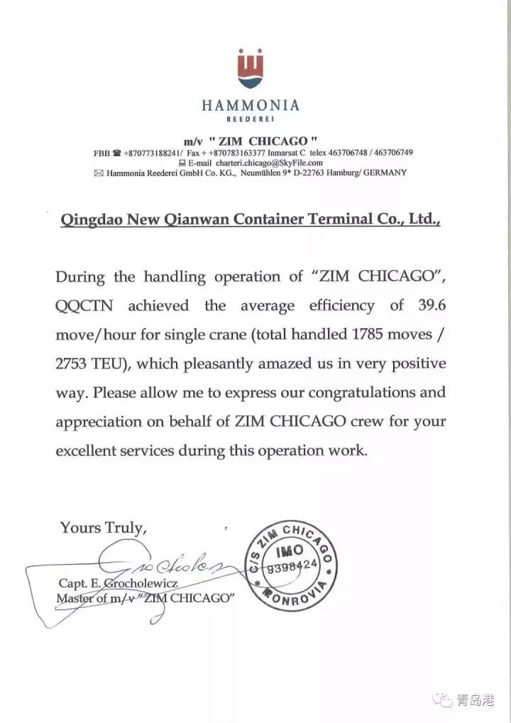 此次青岛自动化码头的“人机大战”首战告捷,“以星芝加哥”轮船长格罗索莱维奇将写有“青岛港单机平均效率39.6move/h”的确认书郑重交给码头总经理张连钢手中,他激动的说:“青岛港创造了集装箱码头行业的世界奇迹,让全世界为中国感到骄傲!”