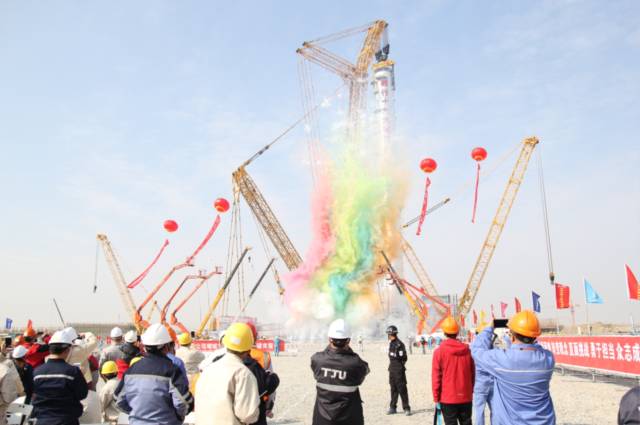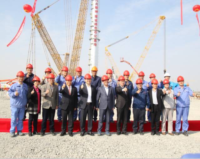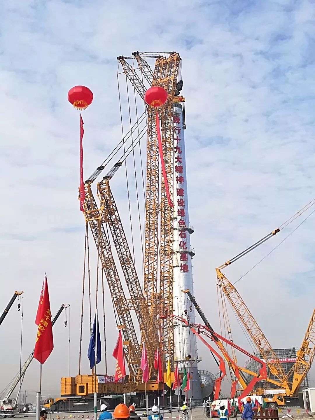 12月23日10时17分,某海岛炼化一体化工程建设工地现场。经过3个多小时的起升溜尾,在徐工4000吨级XGC88000履带式起重机主吊与徐工1250吨级XGC16000履带式起重机溜尾辅吊的合力吊装下,圆满完成了2#丙烯精馏塔吊装就位任务。