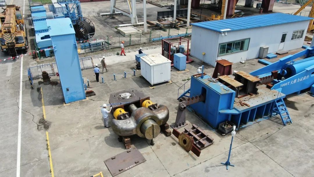 试验中,两只专用油缸加压顶推吊钩承载区,双油缸最大顶推力达3000吨,主要试验3000吨恒定推力下,保持5分钟后,钩体有无变形。
