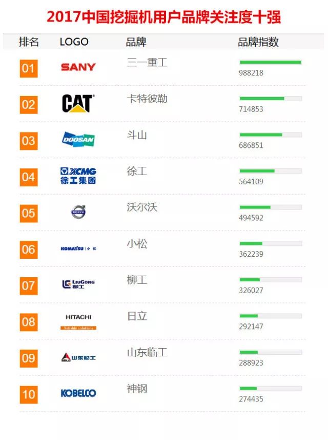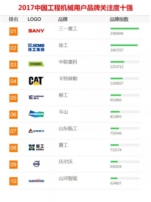 据了解,“2017中国工程机械用户品牌关注度排行榜”是基于网络用户2017全年内对所有工程机械品牌、产品的浏览及在线询价次数而生成的,真实反映了行业用户对品牌及产品的偏好与关注度,客观、公正、权威、准确。
