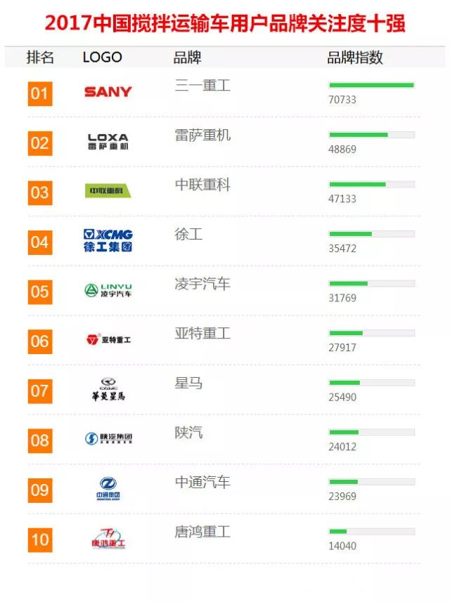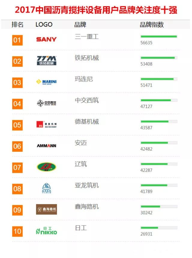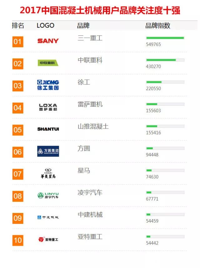 1月8日,中国路面机械网在京发布了《2017年中国工程机械用户品牌关注度排行榜》。三一重工凭借全国客户的高关注度,连续10年蝉联冠军。同时,在混凝土机械、沥青搅拌设备、挖掘机械、搅拌运输车的主要工程机械分榜单中,三一的品牌关注度排名行业第一。