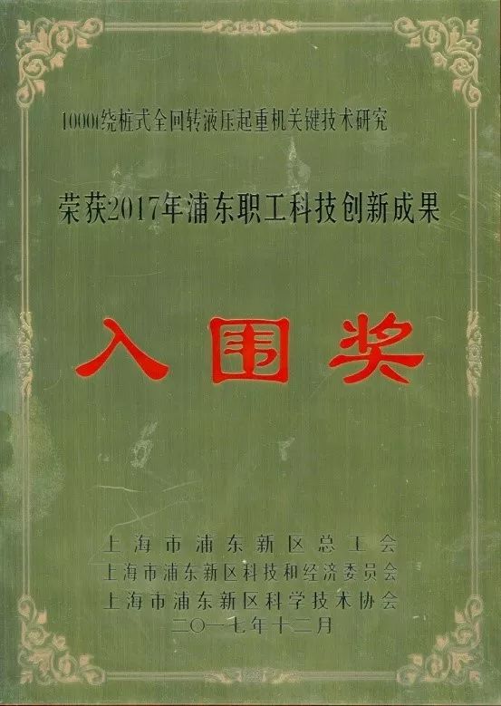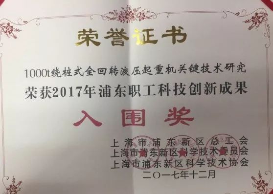 近日,振华重工收到浦东新区总工会的喜讯,由海工集团技术研发中心浮吊所自主研发设计的1000T绕桩式全回转液压起重机荣获了2017年浦东职工科技创新成果入围奖,这是振华重工继2016年500T桅杆吊获得此奖项后,再次将浦东新区科技创新成果入围奖揽入怀中。