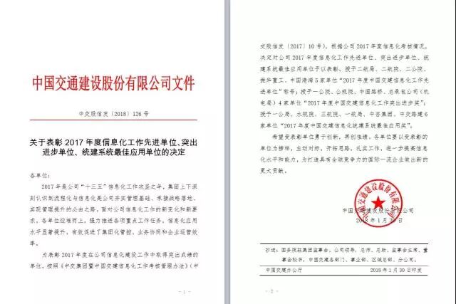随着公司的战略转型,公司高度重视信息化建设工作,过去一年完成了MDG二期物料数据治理工作、ERP项目准备工作、公司微信企业号二期上线、中国交建人力资源系统与公司MDG系统数据集成及“交建通”推广、物资ERP系统和财务共享中心系统对接等信息化工作,在中国交建年度信息化考核中荣获第4名,并首次获得了“2017年度中国交建信息化工作先进单位”的荣誉。