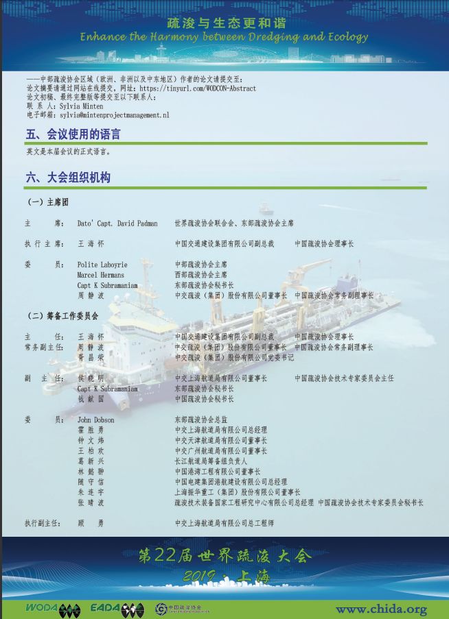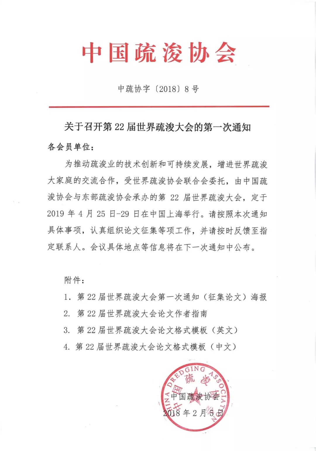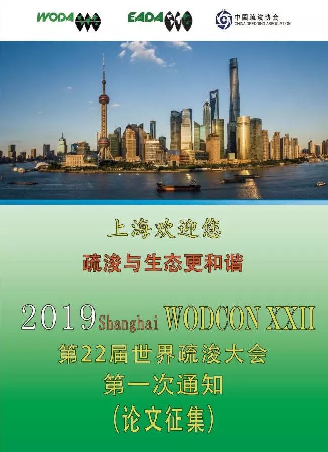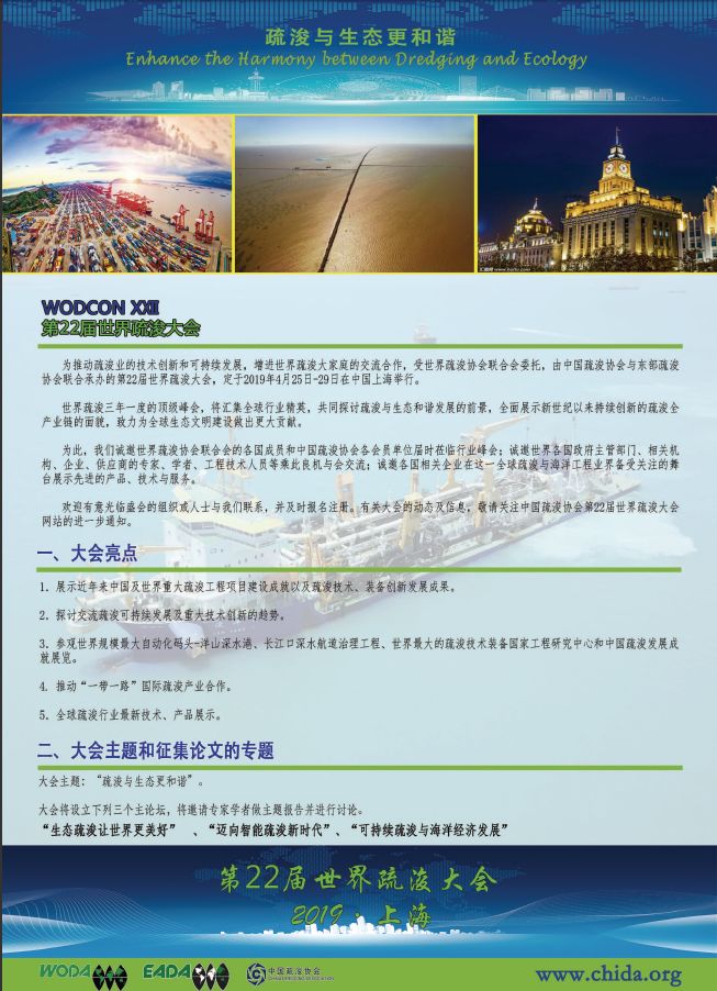 为推动疏浚业的技术创新和可持续发展,增进世界疏浚大家庭的交流合作,受世界疏浚协会联合会委托,由中国疏浚协会与东部疏浚协会承办的第22届世界疏浚大会,定于2019年4月25日-29日在中国上海举行。