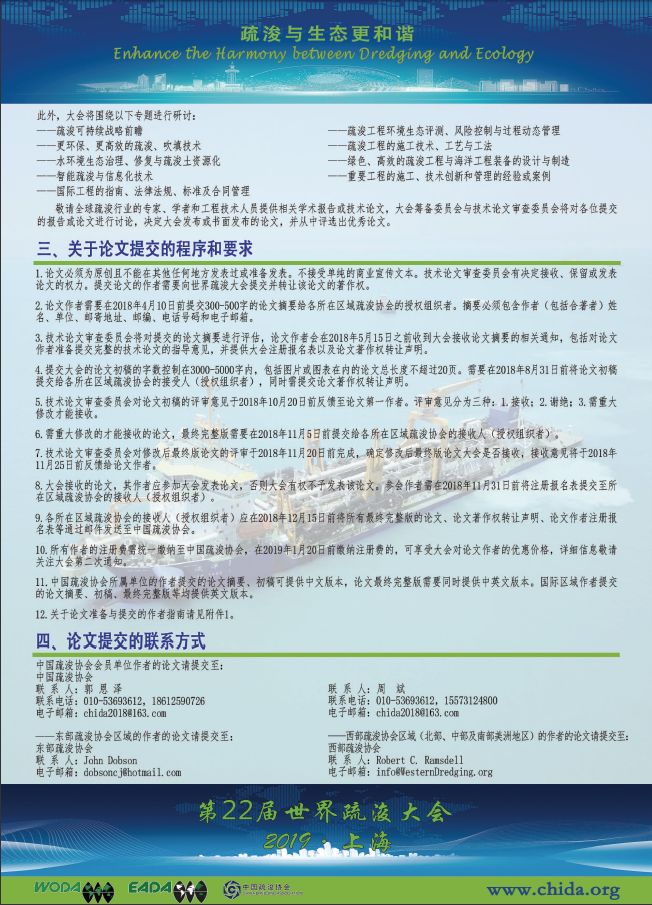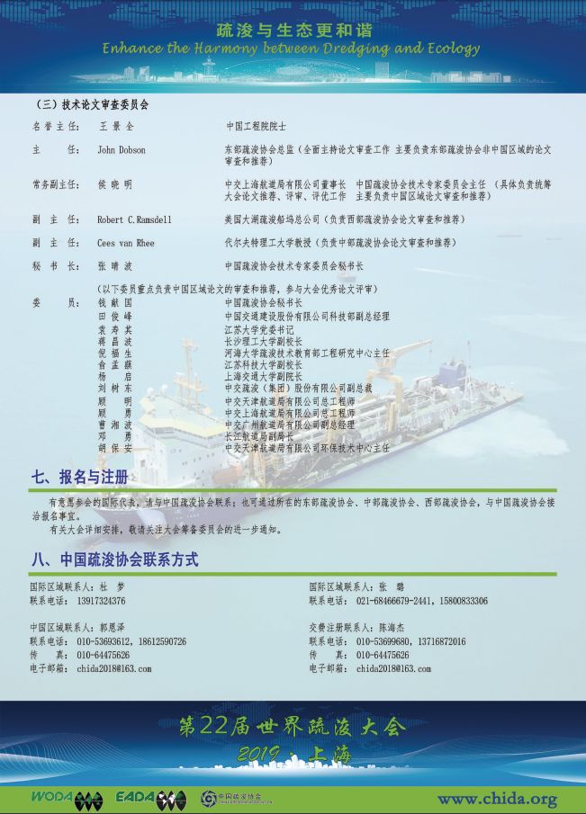 欢迎有意光临盛会的组织或人士与我们联系,并及时报名注册。有关大会的动态及信息,敬请关注中国疏浚协会第22届世界疏浚大会网站的进一步通知。