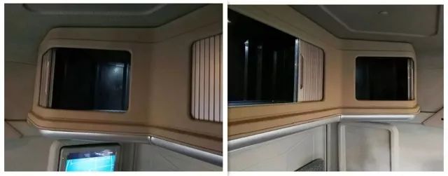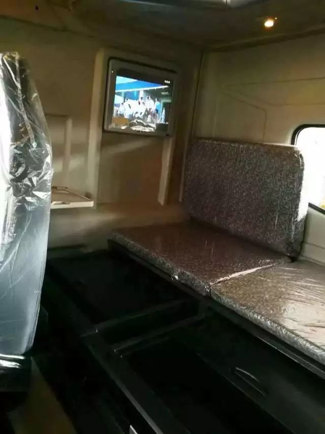 驾驶室非常宽敞,车内超宽的折叠式沙发卧铺大床给人以极佳的舒适感,上方超大面积的储物柜可以满足各种储存需求,车载微波炉、车载电冰箱让司机能够随时随地享用新鲜美食,17寸液晶电视让旅途生活轻松惬意,还有智能车载终端、纯平地板……不愧为国内首个“房车级重卡”!