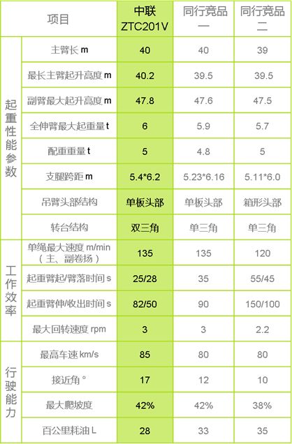 ZTC201V551汽车起重机重30.6吨,高于竞争对手一29.4吨和竞争对手二30.4吨;配备5节40米“U”型主臂,最大起升高度40.2米。