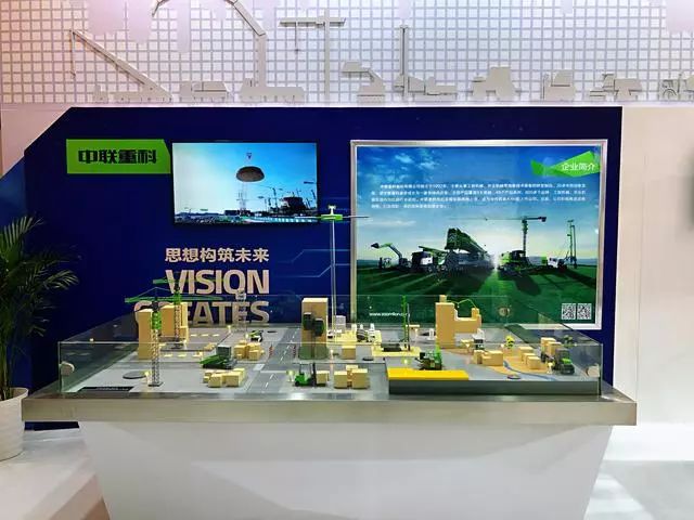 在展区现场,中联重科通过现代展览展示技术和手段,以滚动视频、沙盘等方式,全方位展示中联重科品牌的成就、责任与使命。