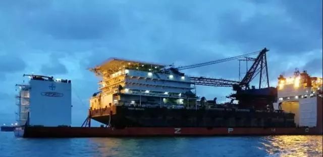 5月27日,5万吨级半潜船“振华33”轮在新加坡锚地顺利浮装一艘铺管船。