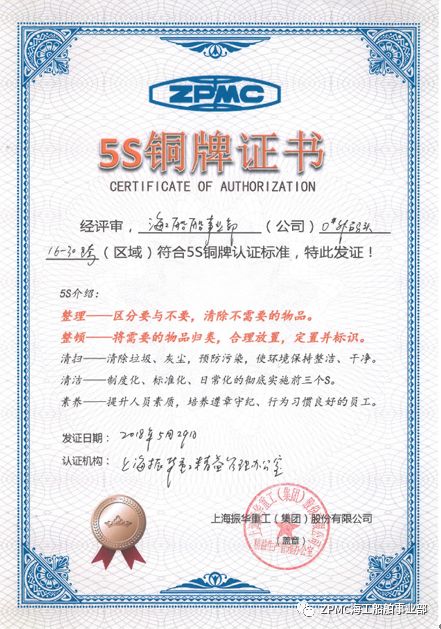 2018年5月29日下午,海工船舶事业部0号外码头16-30跨区域,经过公司精益工作组精益老师现场认证测评,顺利通过5S铜牌认证,是海工船舶事业部精益生产2018年度获得的首张铜牌认证。