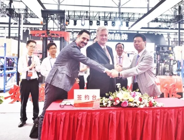 本届大会,合力张德进董事长作为特邀嘉宾出席大会开幕式,25日下午,在合力展区现场,股份公司总经理薛白与ZF集团工业技术事业部副总裁Keinz先生签署了合资项目投资协议。