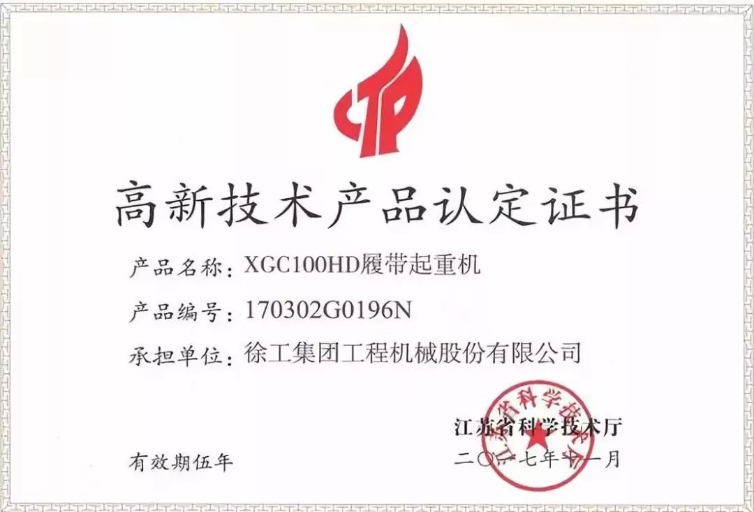 近日,徐工XGC100HD多功能履带起重机顺利通过江苏省科学技术厅认定,荣获江苏省高新技术产品荣誉称号。
