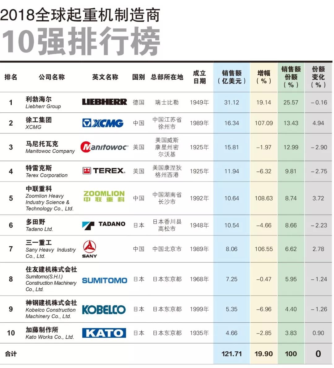 近日,“2018年全球起重机制造商10强榜单”重磅出炉!三家中国企业入围,连续多年领跑中国起重机行业的徐工,位居榜单次席,牢牢占据全球起重机军团第一阵营。...