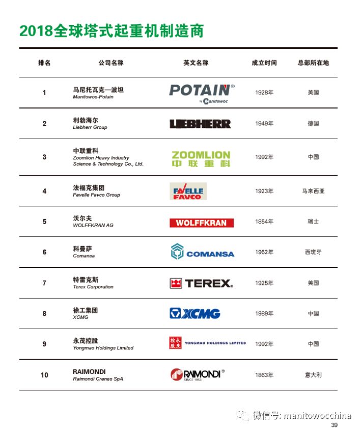 由中国工程机械杂志近日发布的全球起重机行业重量级排名榜单中,波坦获得了“2018全球塔式起重机制造商”第一名。同时,马尼托瓦克亦获得了“2018全球起重机制造商”第三名。