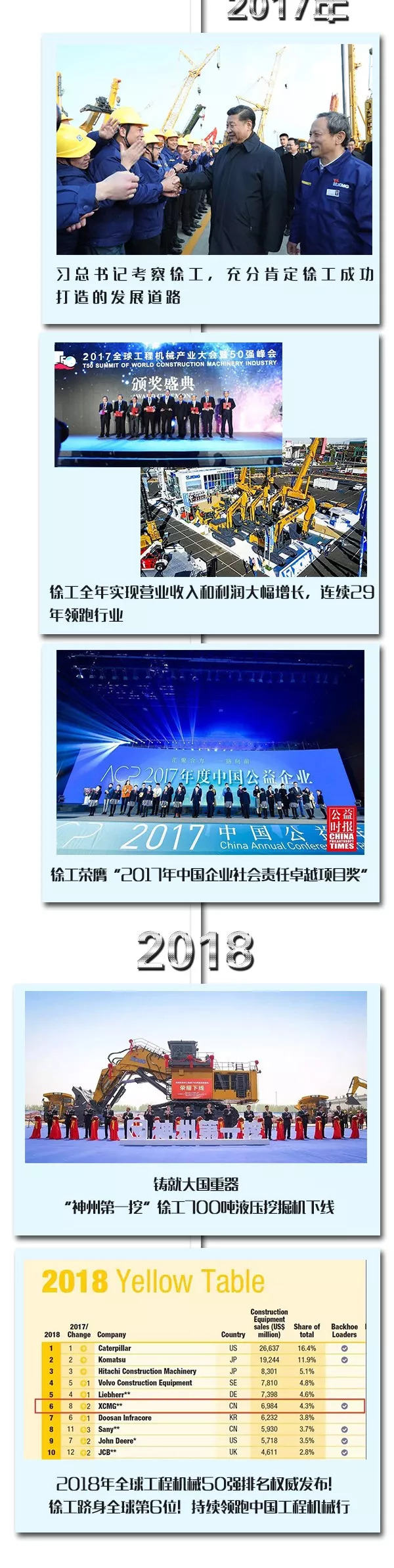 2018年,在全球工程机械50强榜单中排名第六位。