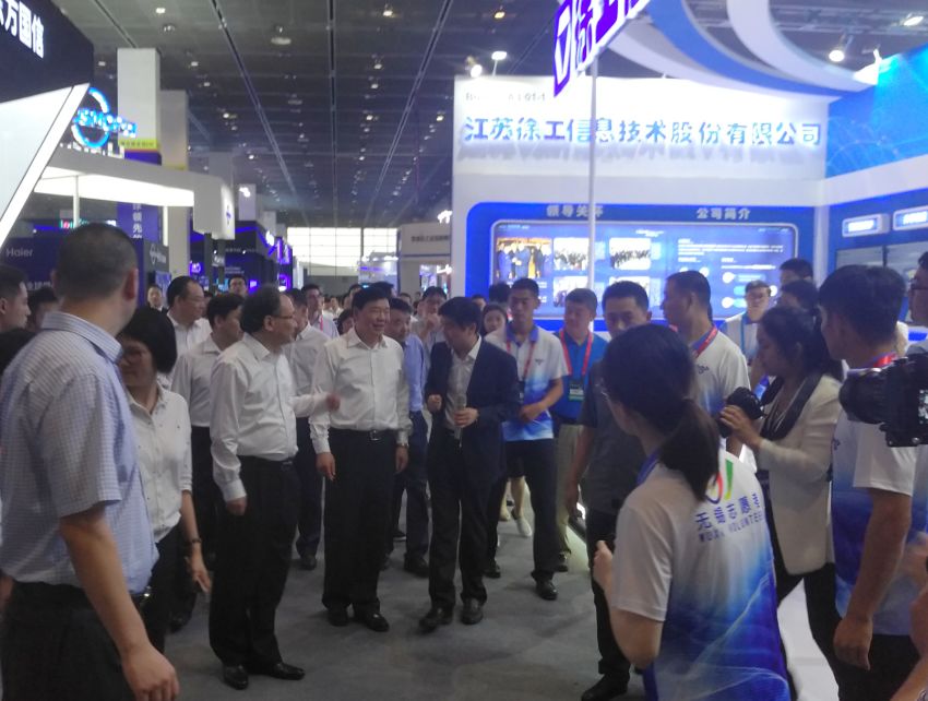 工信部部长苗圩(右二)、江苏省省长吴政隆(右三)、江苏省副省长马秋林(左三)莅临徐工信息展区参观指导,深入了解了工业互联网的市场前景和应用情况。徐工信息总经理张启亮(右一)现场重点汇报了Xrea工业互联网平台的最新创新成果以及跨行业跨领域应用情况。