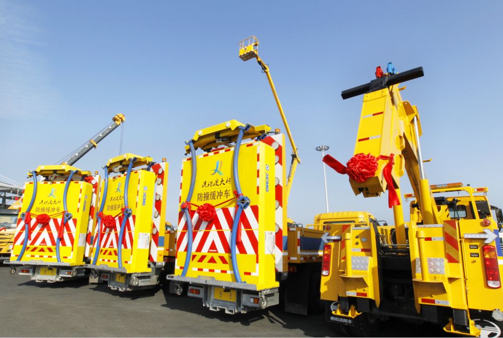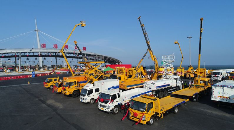 2018年4月,来自徐工的6台防撞缓冲车、2台高空作业车、2台大吨位清障车、2台道路洗扫车、1台随车起重机及1台小型装载机等高端成套化装备整齐排列,与壮美的港珠澳大桥交相辉映,形成一道靓丽的风景线。