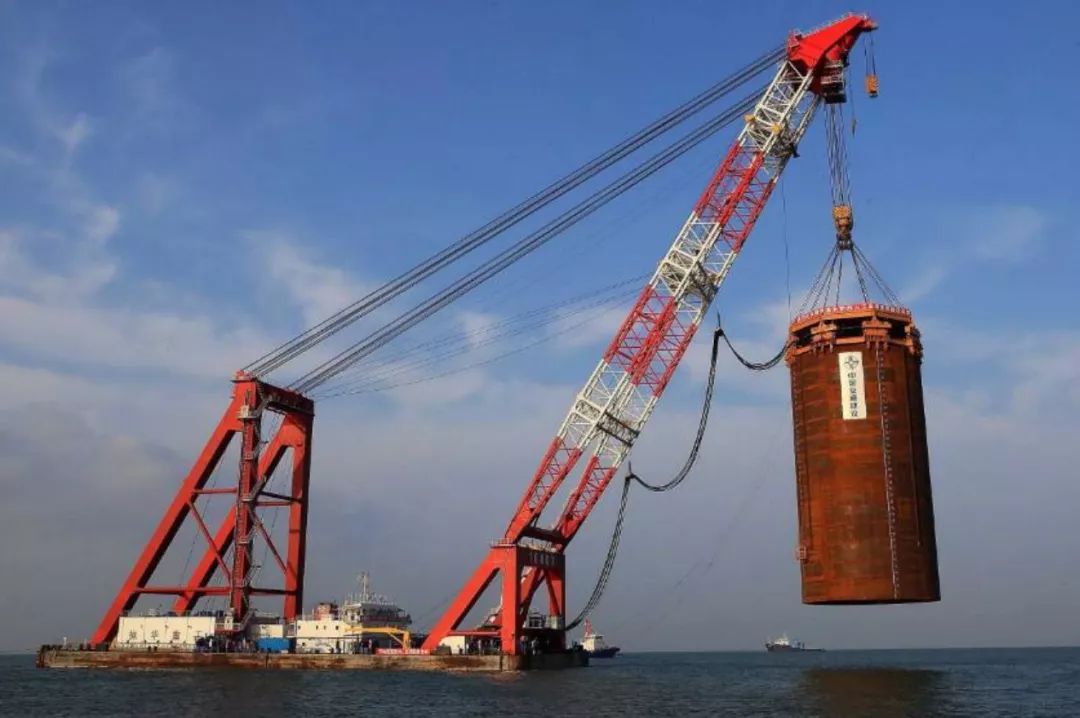 东人工岛上每一座人工岛都由徐工起重机将50米高的60个大圆钢筒围住