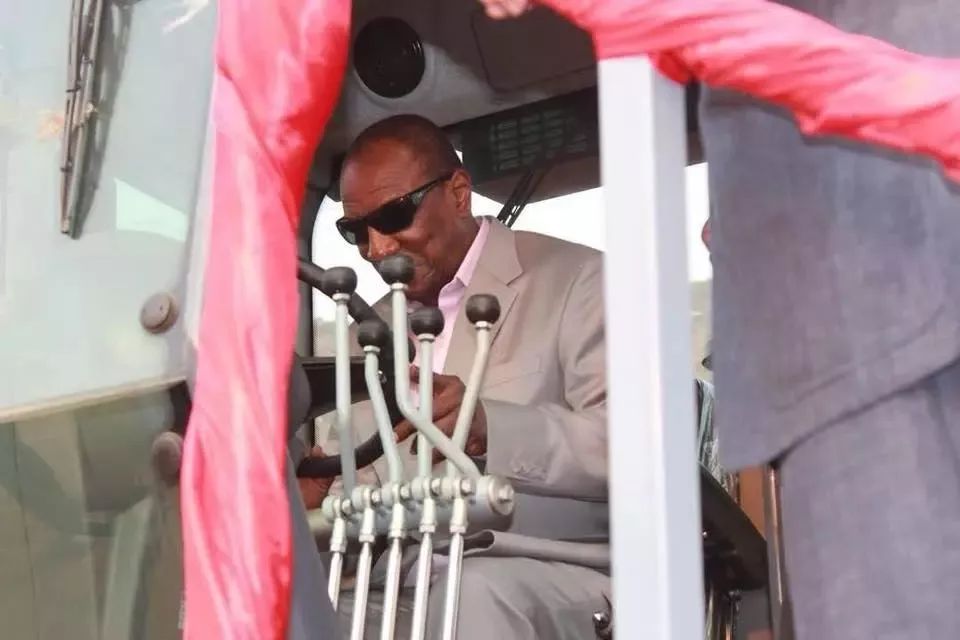 几内亚总统阿尔法·孔戴正在登上徐工机械设备