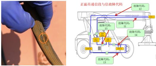 现场维修人员进一步通过试车来发现更多故障表现,当测试到设备伸缩大臂操作时,设备频繁出现1#和11#报警。根据这一现象,维修人员立马将大臂线束抽出检查,发现大臂上连接吊具控制器D791-1的通信线出现磨损搭铁。线束磨损情况如下左图所示: