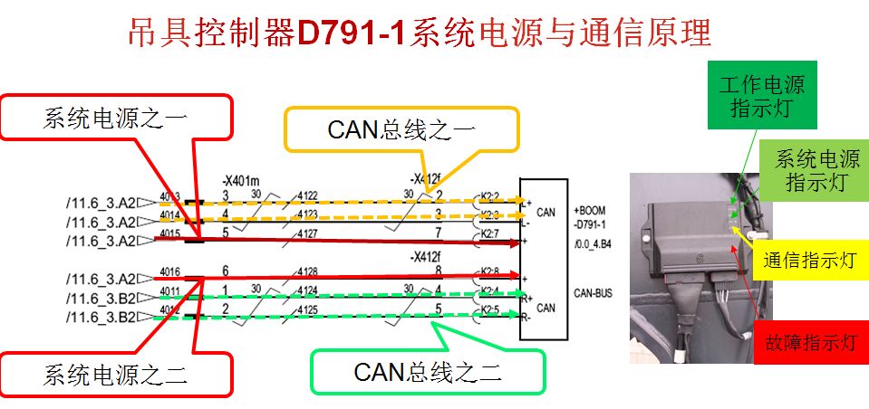 于是,维修人员开始检查驾驶室主控制器D790-1至吊具控制器D791-1的两路系统供电电源,包括驾驶室X51的6789接口和吊具控制器K2:7/8的接口电压。检查结果均正常,维修人员也未发现控制器的系统电源故障代码报警,由此可判断系统电源正常。