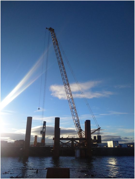 10余台徐工履带起重机正在摩尔曼斯克港参与码头工程的吊装工作。