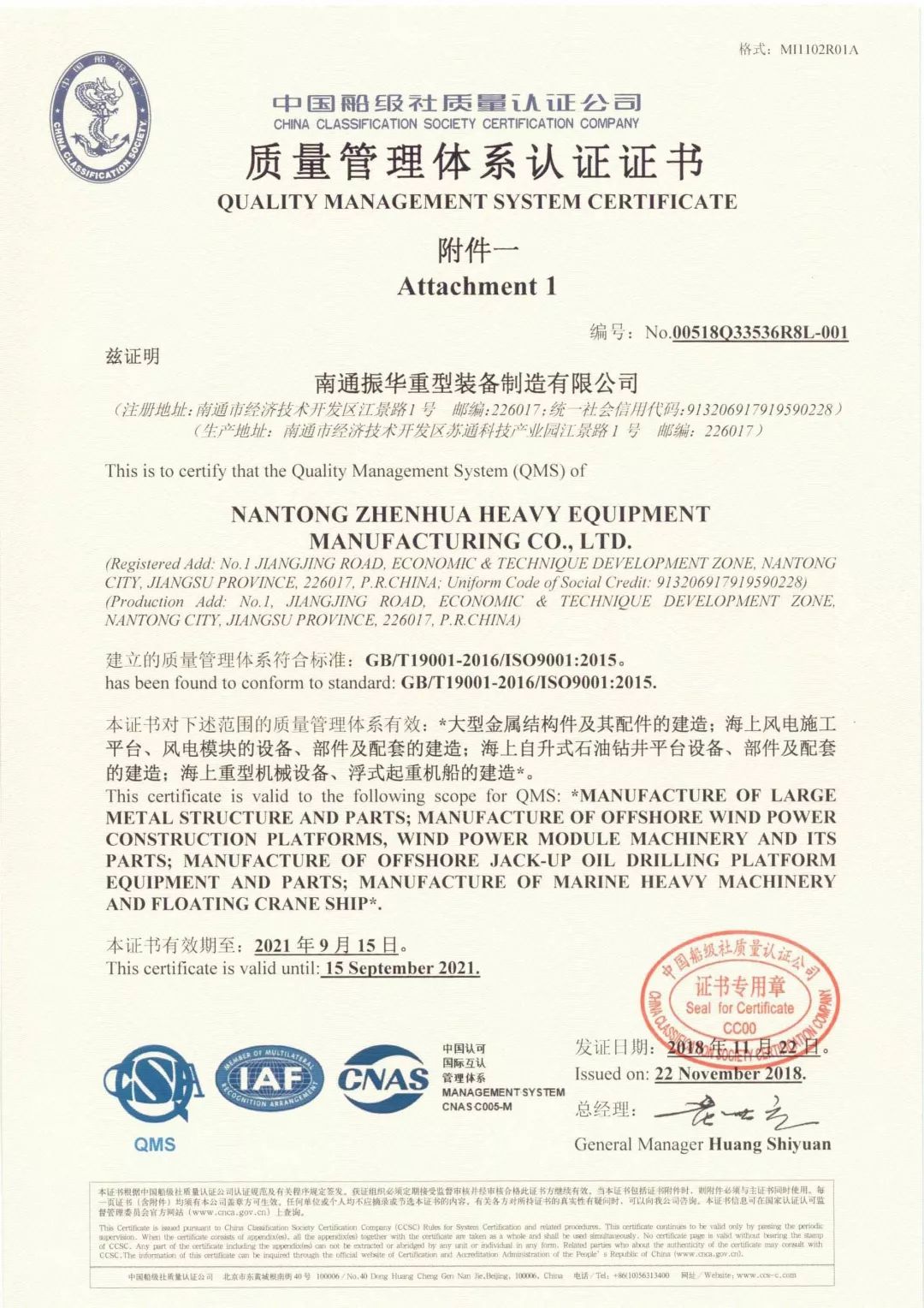 11月27日,南通振华重型装备制造有限公司(以下简称南通重型装备)获得中国船级社质量认证公司颁发的质量管理体系认证证书,标志着南通重型装备顺利通过ISO9001:2015版质量管理体系认证工作。