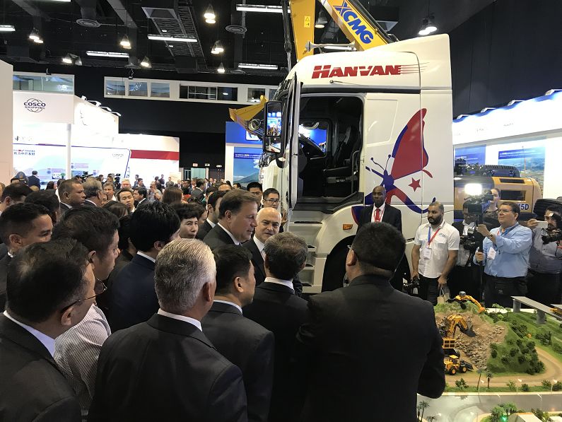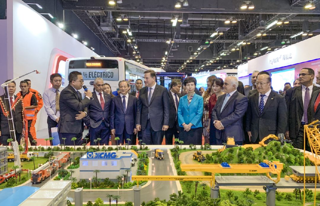 下午7点,巴拿马总统巴雷拉来到Atlapa展馆,在徐工展区,巴雷拉总统在徐工产品沙盘前驻足观看,不时赞叹徐工集团的产品线齐全,并赞许徐工在全球工程机械市场取得优异的成绩。他说:巴中建交以来,双边关系取得重大进展,中国企业的发展为全球提供了有益经验。希望徐工集团作为“中国榜样”,充分利用巴拿马的区位优势,积极促进巴中双方的经济发展。