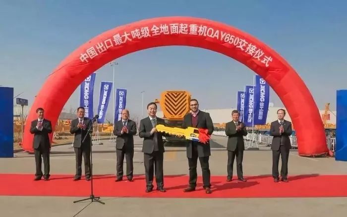 今年3月,全球最大的轮式起重机制造基地,徐工机械副总裁、起重机械事业部总经理孙建忠将QAY650全地面起重机金钥匙交付到北非用户手中