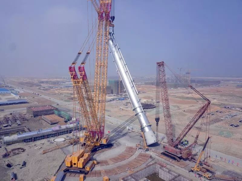 此次吊装使用徐工XGC88000—4000吨级履带起重机与徐工XGC16000—1250吨履带起重机协同作业,采用双机抬吊溜尾递送吊装工法,主吊车XGC88000履带起重机采用102主臂+33米固定副臂工况,吊装就位工作半径34米,XGC16000履带起重机配合溜尾,两台千吨级履带式起重机 “携手登台”,一气呵成,将2号丙烯塔这个“巨无霸”稳稳抬起。下午15点58分,历经七个多小时的作业,中科炼化一体化项目最大高塔安全、顺利吊装就位。