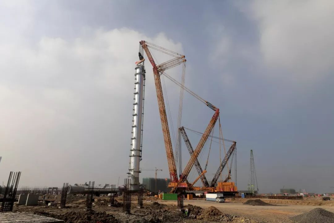 2019伊始,该项目迎来了难度系数最高吊装任务——蒸汽裂解装置2号丙烯塔吊装。据了解,2号丙烯塔塔体直径6.804米,安装高度达到108.6米,主吊起重量达到1435吨,是中科炼化一体化项目工程中体积最大、高度最高、吊装难度最大、吊装要求最严格的大型超限设备,是整个大件吊装运输工程中的“重中之重”。
