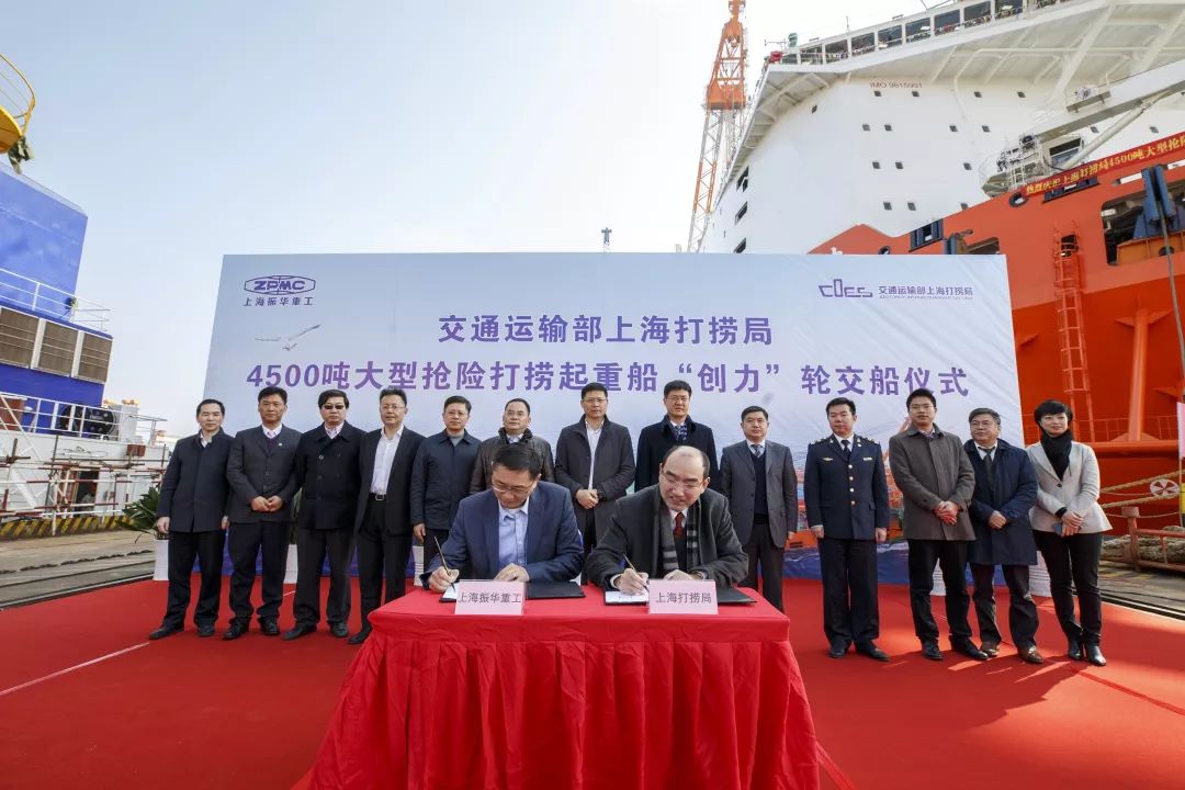1月25日,振华重工为交通运输部上海打捞局建造的4500吨打捞起重船项目“创力”号,在振华重工启东海洋工程股份有限公司顺利交付。交通运输部上海打捞局局长洪冲,振华重工总裁、党委副书记黄庆丰及船级社、海事局有关领导和代表共同出席并参加了交船仪式。