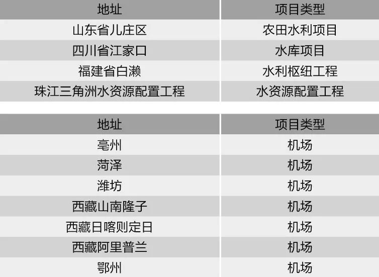 2019年计划开工大型机场有毫州机场、菏泽机场、潍坊机场、鄂州机场等;计划开工水利项目有台儿庄农田水利项目、江家口水库项目、白濑水利项目等。