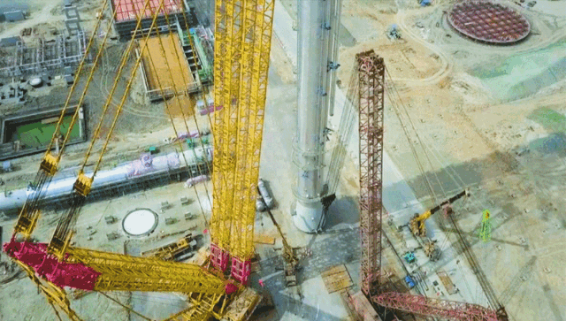 据了解,乙烯2号丙烯塔塔体直径6.804米,起竖安装高度达到108.6米,主吊起重重量达到了1435吨,是整个中科炼化一体化项目工程,设备体积最大、高度最高,吊装难度最大、吊装要求也最高的大型超限设备,是整个大件吊装运输工程中的重中之重。