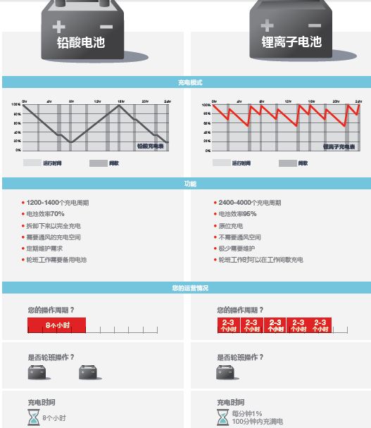 锂离子电池充电速度更快。尽管具体的充电时间会受到充电器的影响,但总体而言,以8小时工作制为例,使用铅酸电池的空箱堆高机充满电需要8-10小时,而锂离子电池只需两小时左右就可以充满。铅酸电池充电需要两根63A的保险丝接至主电源,而锂离子电池需要四根63A保险丝。