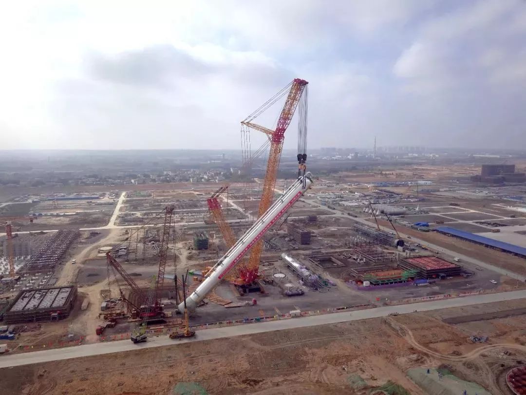 6月20日下午6时16分,徐工四千吨级“巨无霸”XGC88000履带式起重机与500吨履带式起重机合力,将中科炼化大型设备——煤制氢装置吸收塔顺利吊装就位。