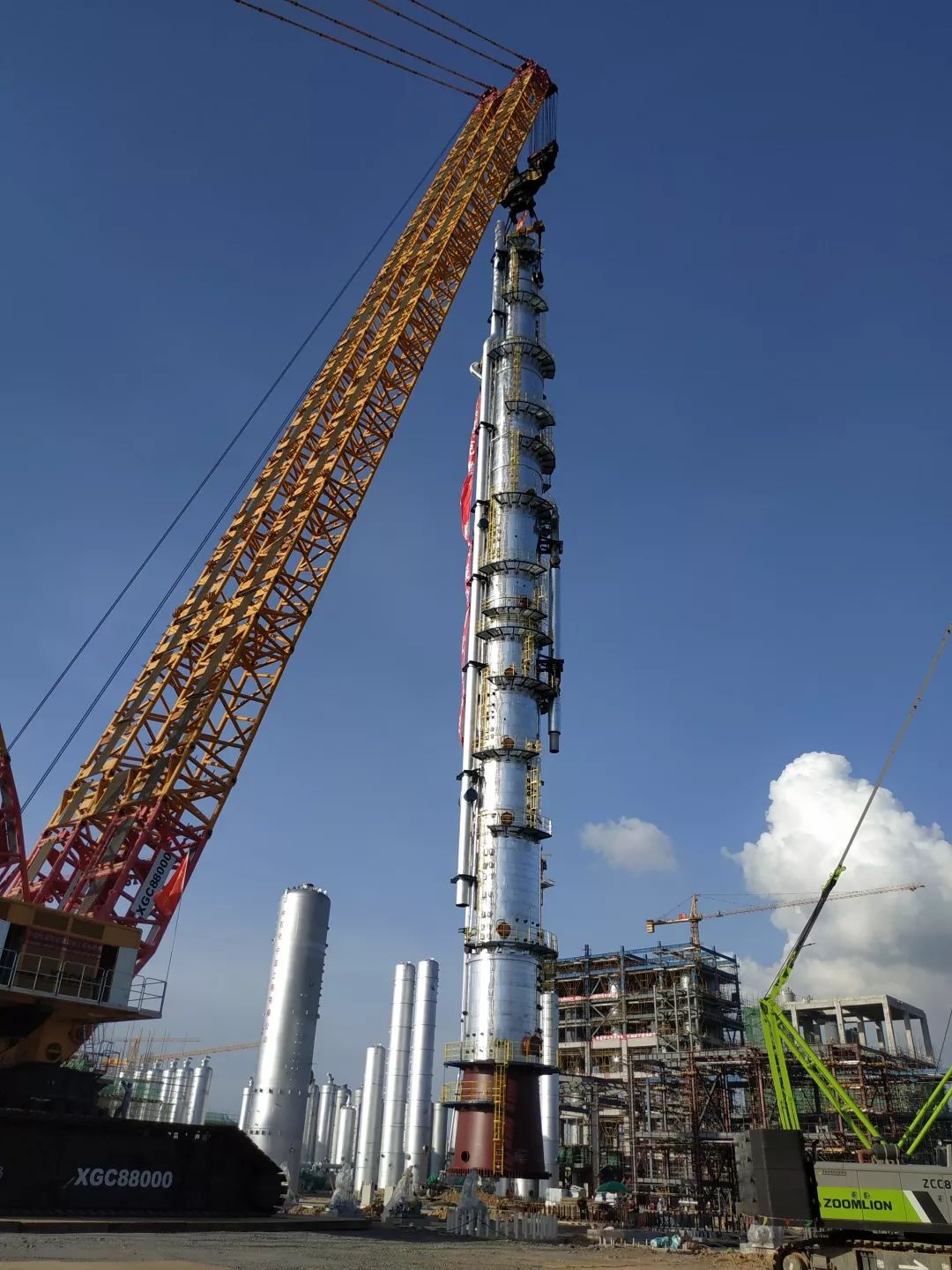 吸收塔是煤制氢装置的第一高塔,也是该装置关键核心设备,直径4.8米,高约90米,抬吊总重800多吨,该设备吊装就位在中科炼化一体化项目中具有里程碑的意义。