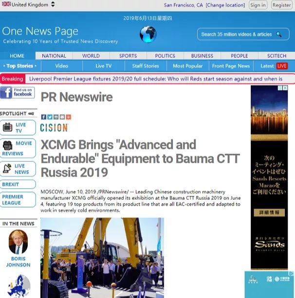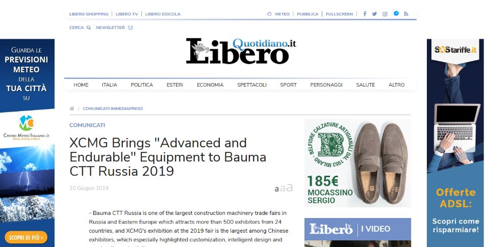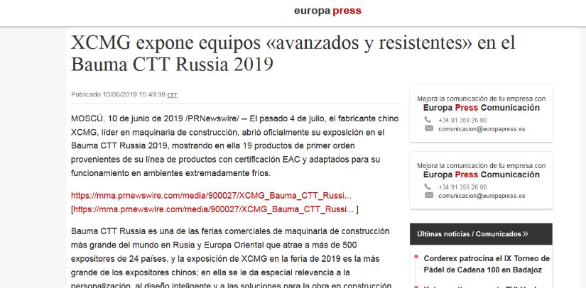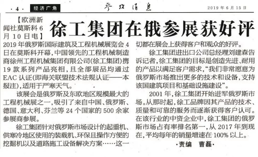 《参考消息》的这篇新闻报道,对徐工集团在2019俄罗斯CTT展取得的成功,以及徐工在俄罗斯的发展情况等进行了详细描述,并对徐工在促进中俄友谊方面所做出的努力给予了充分肯定。随即英国新闻门户网站One news page、意大利知名报纸Libero Quotidiano、西班牙国际新闻通讯社Europa Press等44个国家400多个国际知名媒体也纷纷对徐工在俄参展的情况进行了大篇幅宣传报道。