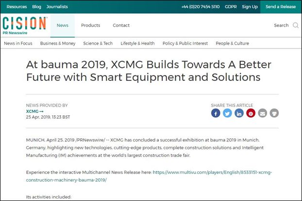 德国宝马展,徐工受到德国电视二台、英国门户网站PR Newswire UK等近百家媒体的关注