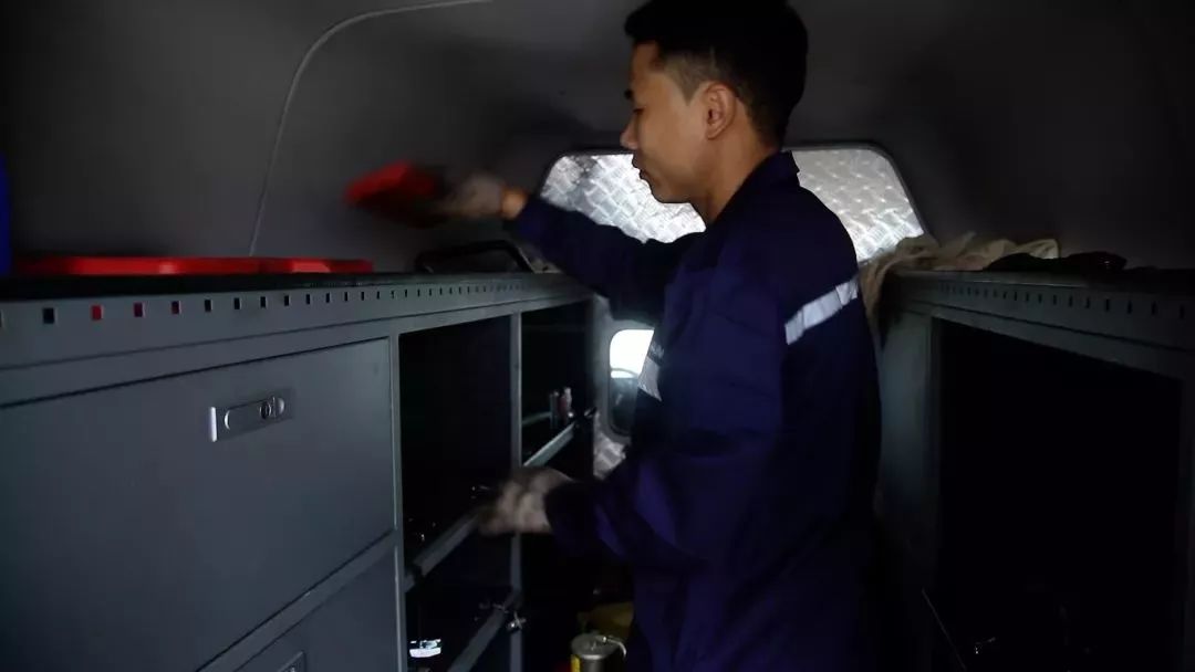 因为现在工程项目多,这些设备整天泡在工地里,每天的工作强度非常大,难免会有些问题。他们通过仪器的检测可以诊断出车子的一些故障隐患,如需要更换零配件的,尽量在现场更换。这样就确保了设备能正常运转,保证项目的施工进度。上午忙完之后,趁着客户去吃饭,他在车里打了盹,长年在户外工作,让他们这些售后人员有了很强的适应能力,相比外面的暴晒和泥泞的工地,工具车里相对来说已经是很舒服的地方了。