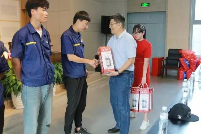 江苏建院教务处处长戚豹、智能制造学院院长仇文宁为储备海外服务工程师赠送出征慰问品。