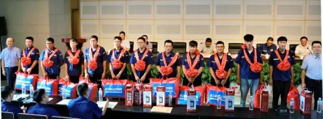 公司总经理陈卫东、党总支副书记李红飞为储备海外服务工程师赠送出征慰问品。