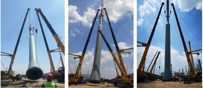 QAY650带着它的两个“大兄弟”QAY500、QAY240决战鄂尔多斯准格尔旗的广袤大地,进行重180吨,高88米的放空筒安装。