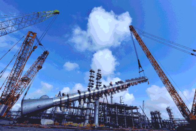 6月20日,在4000吨“世界第一吊”和500吨履带吊的合力下,煤制氢装置吸收塔顺利吊装就位。