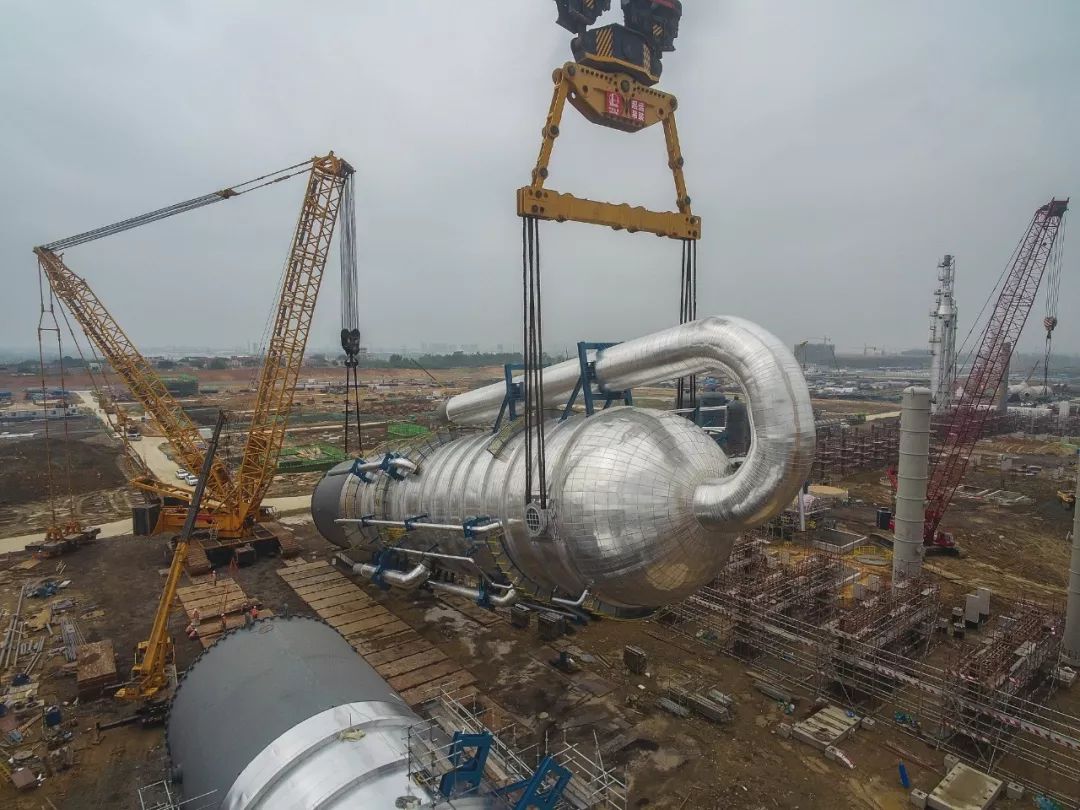 3月15日,中科炼化项目“最胖”大塔——80万吨/年乙烯蒸汽裂解装置的急冷油塔顺利起吊安装就位。