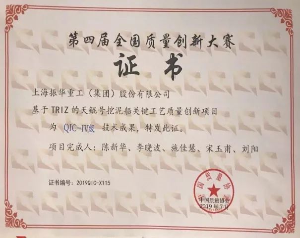 经过前期的精心策划和准备,振华重工申报的“基于TRIZ的天鲲号挖泥船关键工艺质量创新项目”经大赛组委会审核后录取。在现场答辩环节,公司代表围绕创新项目的新颖性、实用性、知识性、顾客导向、有效性这五个方面对“天鲲号”的质量技术创新进行了阐述,并对现场专家的提问进行解答,获得评委的一致好评。最终,振华重工“基于TRIZ的天鲲号挖泥船关键工艺质量创新项目”获得“QIC-IV级技术成果”,并荣获“第四届全国质量创新大赛”证书。