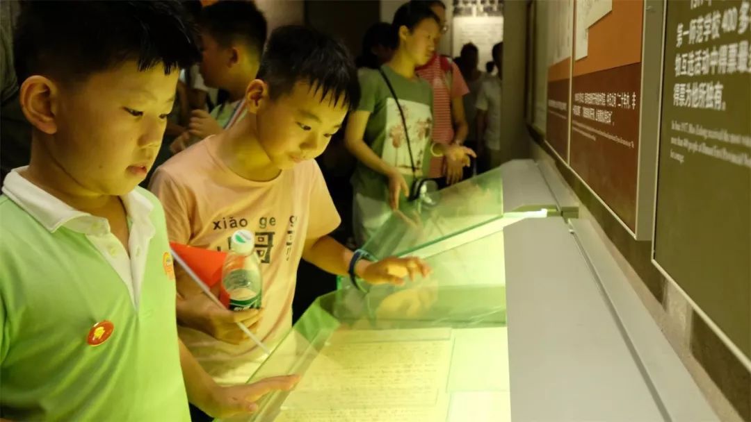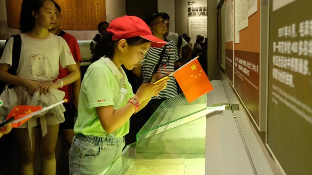 临近正午时分,韶山毛泽东同志纪念馆门前排满了前来瞻仰学习的各地游客们,其中身着绿色营服的小营员们分外引人注目。顶着烈日,小营员们依旧秩序井然。进馆参观后,馆内的革命物件与革命故事深深吸引着小营员们,频频驻足留影。
