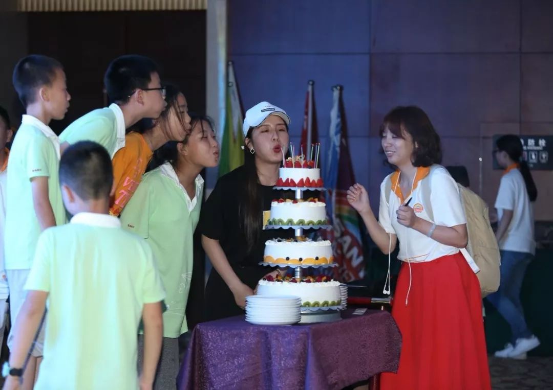 晚会上,细心的工作人员们更是贴心地为现场临近生日的小营员及领队老师们准备了神秘的生日惊喜。灯光熄灭,现场响起了温馨的生日快乐歌,工作人员将蛋糕缓缓推入现场,在众人的见证下,寿星们共同许下心愿并将生日的喜悦分享给在座的每一位,场面温馨。
