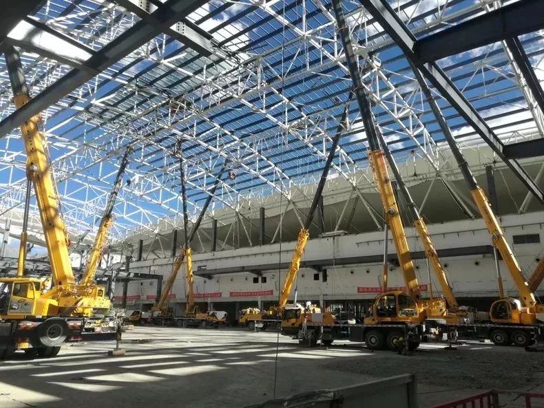 近日,标志性建筑——拉萨会展中心改造项目进入冲刺阶段,该工程结构类型为钢框架-钢筋砼剪力墙结构以及双曲钢桁架支撑的玻璃幕墙屋盖,涉及到钢结构拆除、曲面玻璃幕墙施工等多个方面,专业交叉多,施工难度大,有效工期短,对工程建设提出了很高的要求。而在顶棚的安装环节中,40台清一色徐工起重机巨臂擎起,安全高效的完成吊装任务。